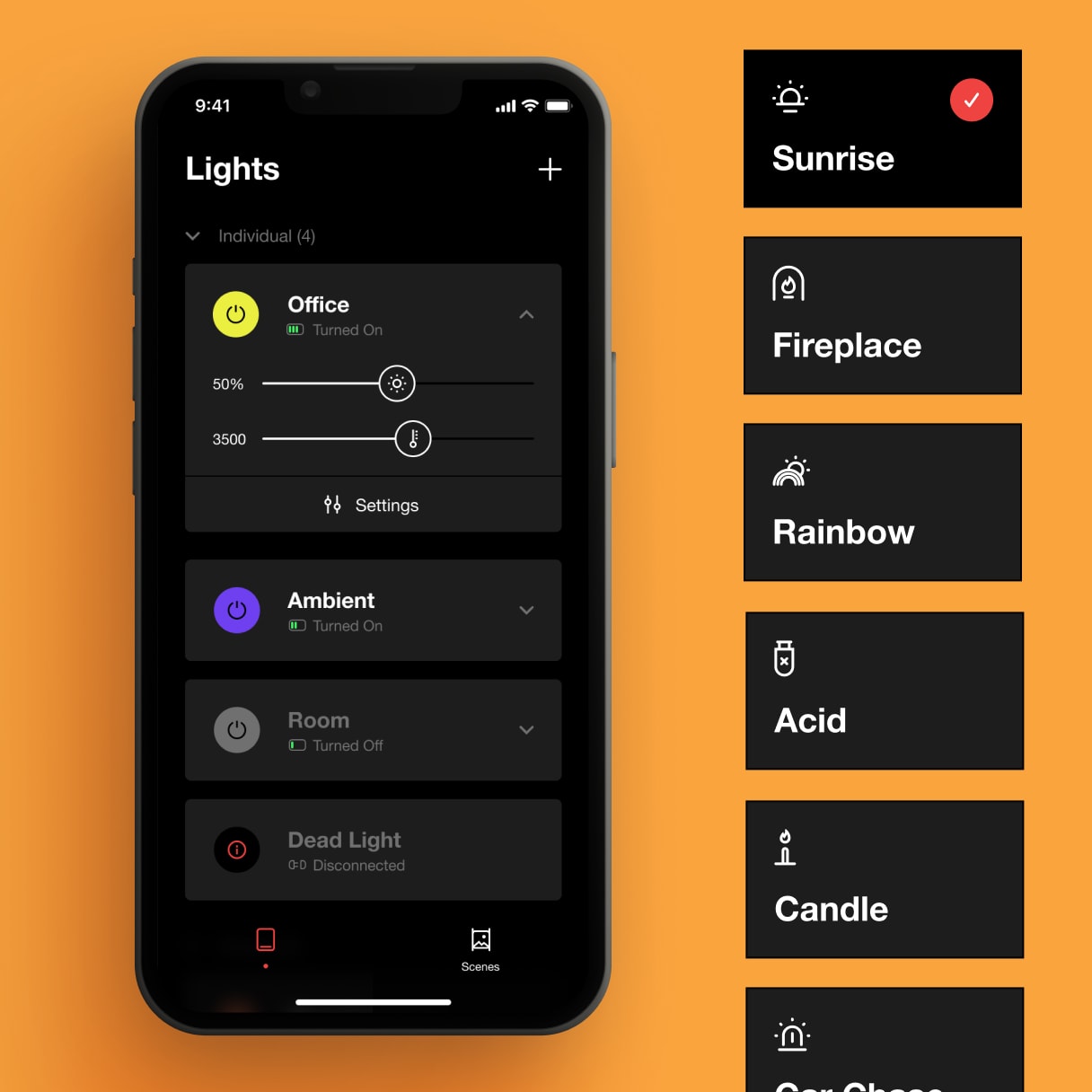 With the Slite app, we allow our users to set up the lights over Bluetooth in a few taps to then personalize the creative experience of their endeavors. Whether we're talking sparkly effects or simply presets for an outdoor shooting, the goal was to minimize the time spent to setup the scenes and allow for more time spent what they love: creating.